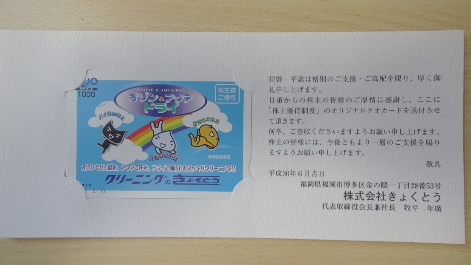 【株主優待】きょくとう(2300) クオカード1,000円相当